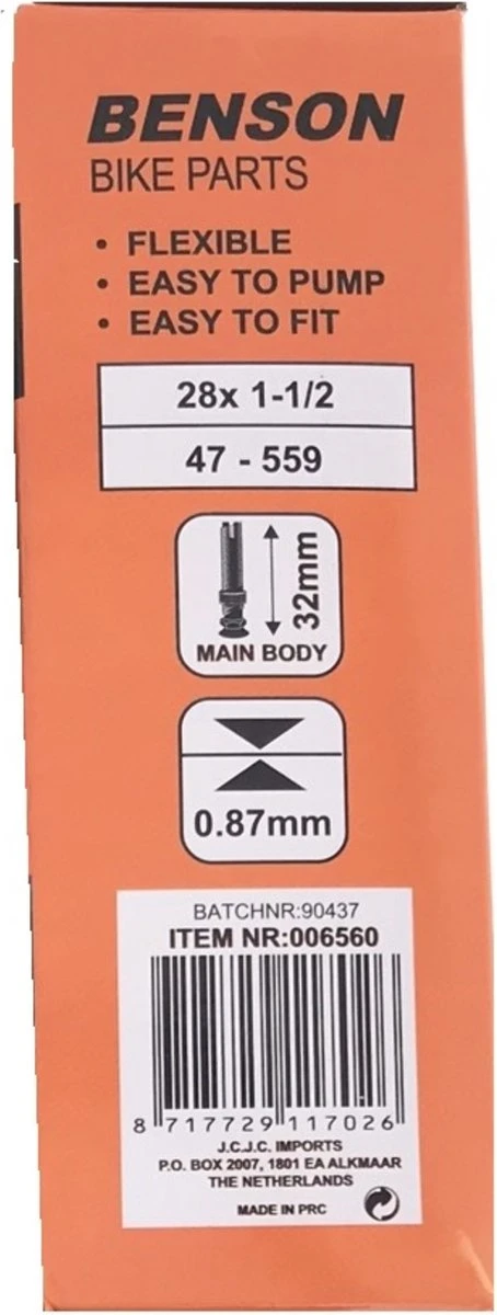 De binnenbanden van Benson onderscheiden zich door een uitstekende prijs- kwaliteitverhouding, met name geschikt voor 28 inch aTB, mountainbike of fietsen. Uitgevoerd met een blitz (Hollands) 40 mm ventiel. De banden zijn gemaakt van hoogwaardig rubber; wat garant staat voor een lange luchtdichtheid. Door de hoge mate van elasticiteit is de band in staat je buitenband zo goed mogelijke te vullen en ondersteunen.