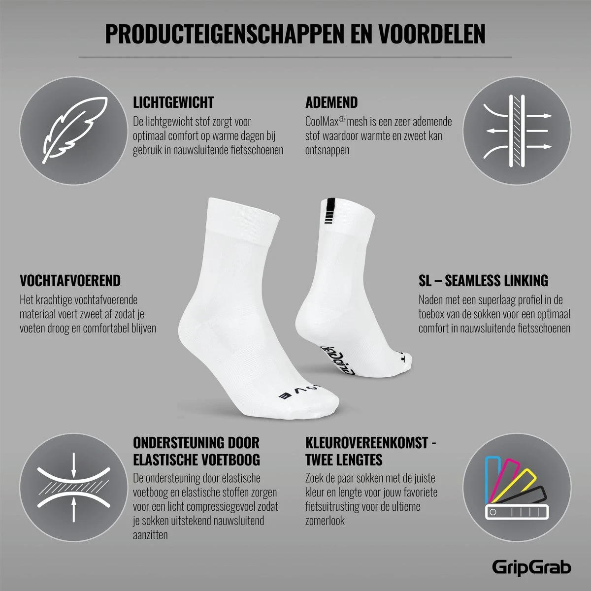 De korte GripGrab Lightweight SL-fietssokken zijn lichte en stijlvolle, korte zomersokken. Deze fietskousen zijn gemaakt van het actief ademende en zachte Coolmax-materiaal, waardoor ze uitstekend geschikt zijn voor ritten bij heet en vochtig weer. Dankzij de zones met open mesh kunnen de voeten ademen, terwijl het naadloze design je tenen het ultieme comfort biedt.