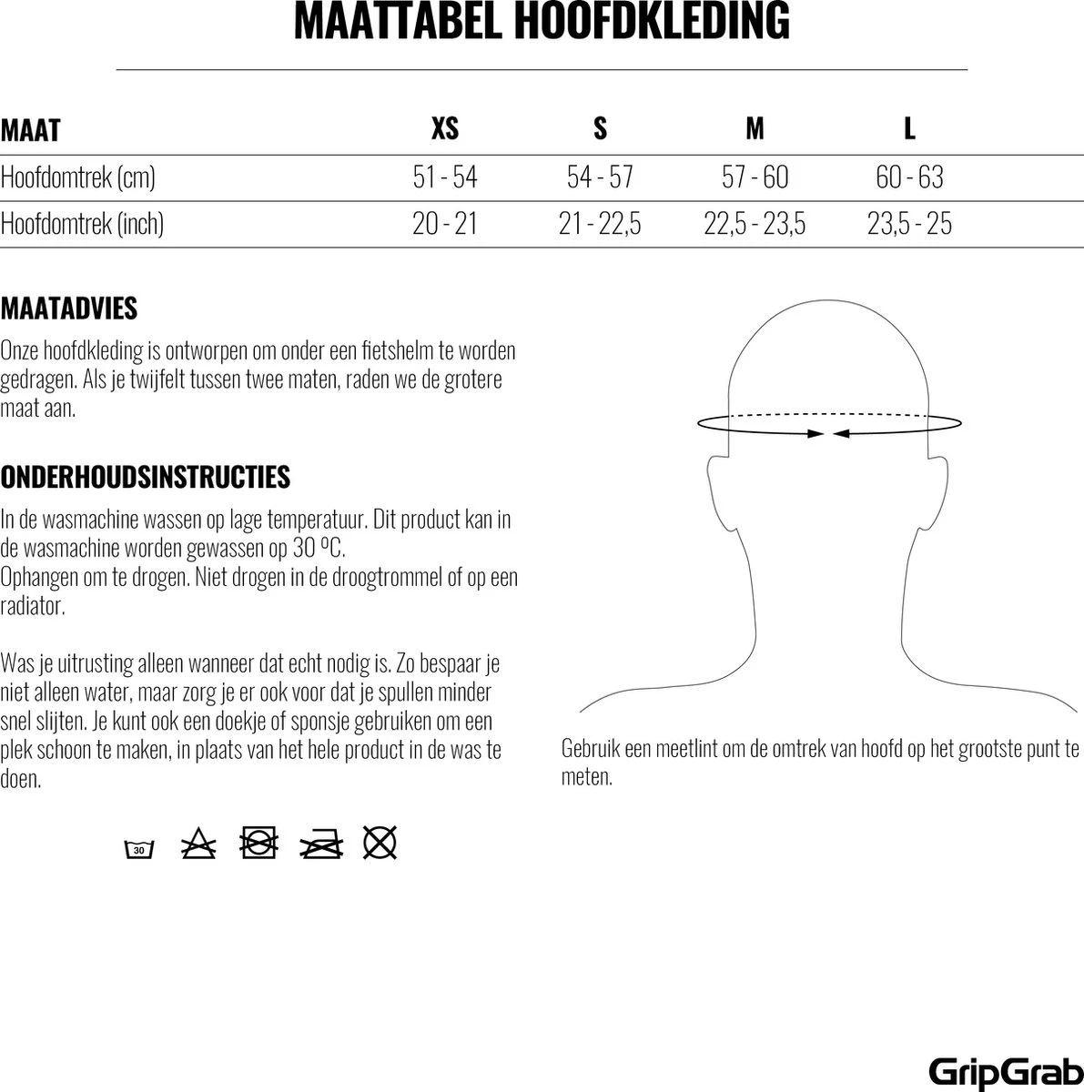 Materiaal: materiaal 94% polyester, 6% elastaan. Kleuren: zwart. Maten: verkrijgbaar in XS (51-54 cm hoofdomvang), S (54-57 cm), M (57-60 cm) en L (60-63 cm). Voor meer informatie verwijzen we naar de maattabel in de productafbeeldingen. Wanneer je tussen twee maten in zit, raden we aan om de grotere maat te kiezen. Leveringsomvang: 1 x GripGrab Winter Facemask, fietsbivakmuts.