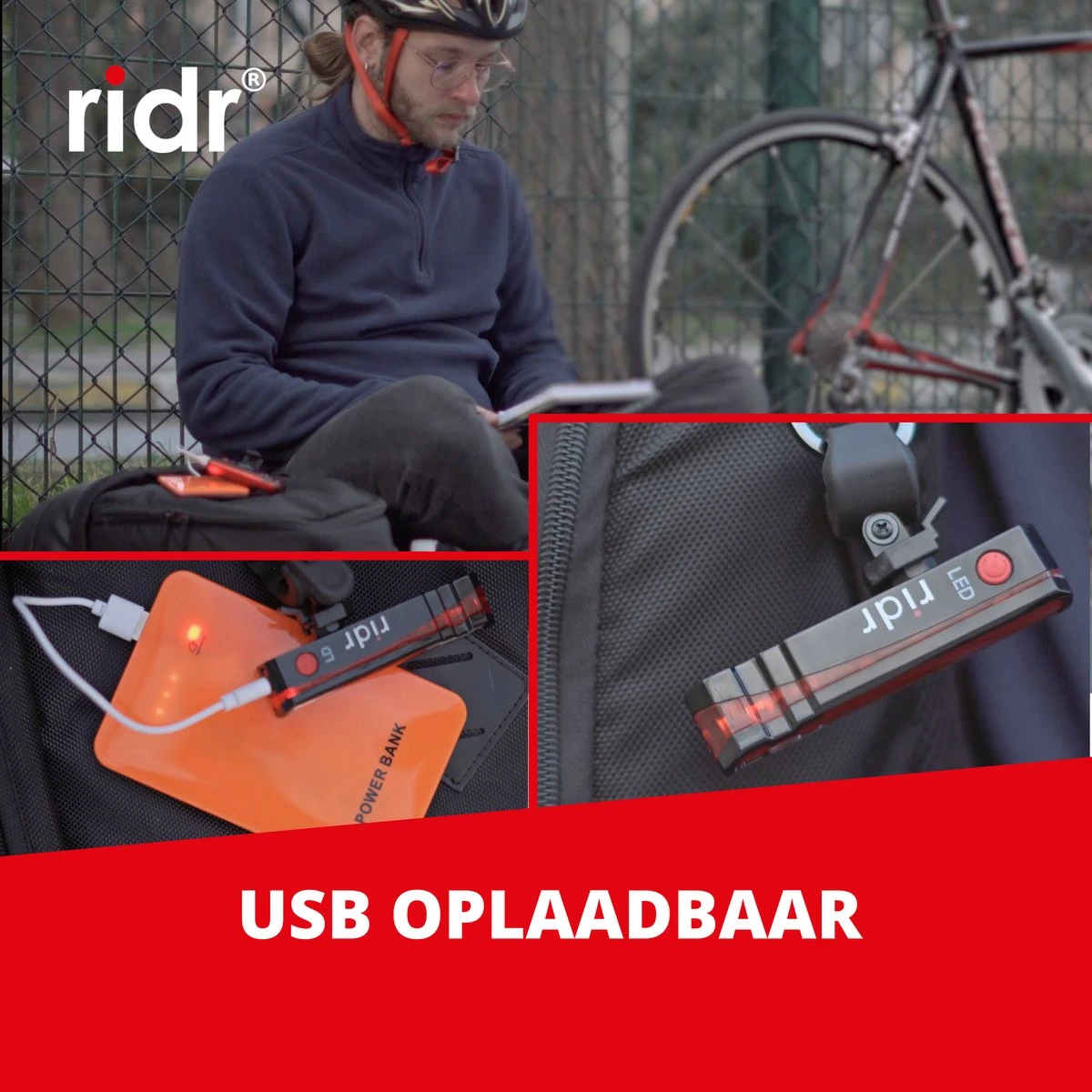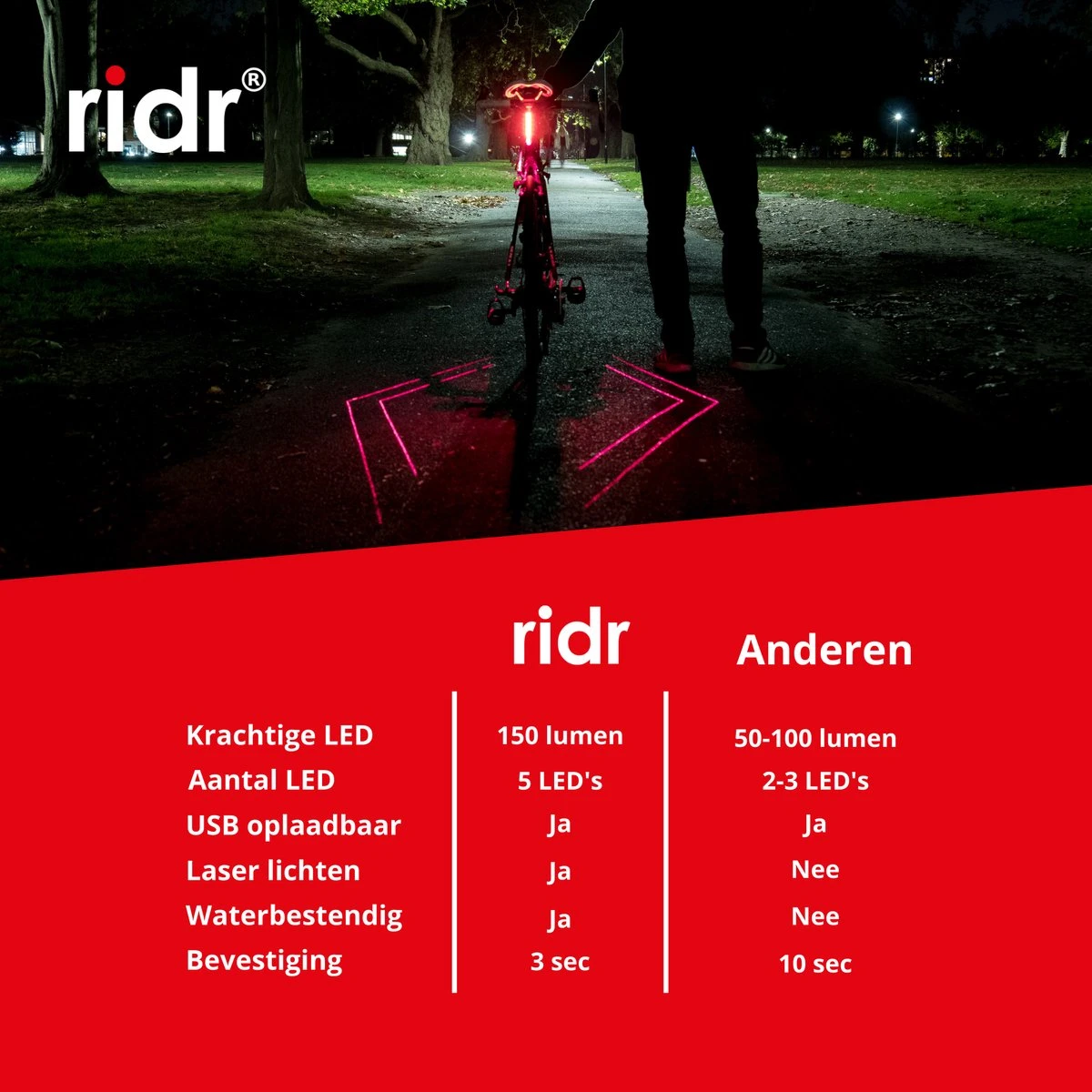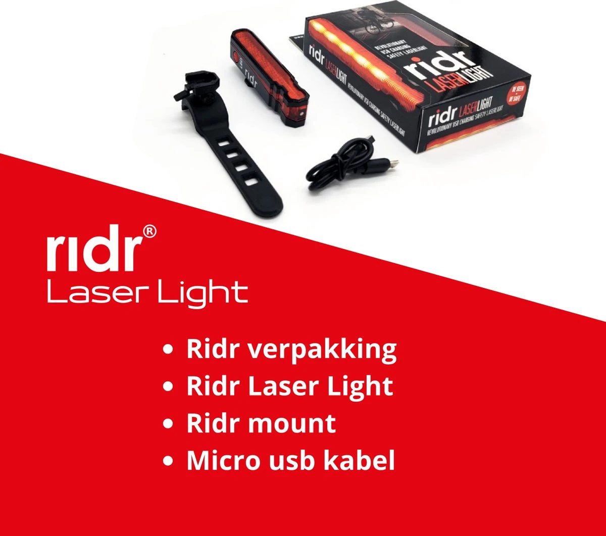 RIDR Lights is een revolutionair 2-in-1 fietslicht. Met 5 sterke LED’s en 2 extra Laser diodes geniet je van maximale zichtbaarheid op de baan. De Laser Lights vormen een dubbel patroon op de grond om auto’s op een veilige afstand te houden en beter zichtbaar te zijn voor het verkeer. Met RIDR Lights neem je je veiligheid in eigen handen!